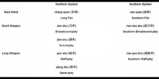 Modern wushu encompasses a wide variety of Chinese martial arts styles, which can be categorized in several ways. Along one axis, wushu is divided into barehand and weapon-play styles, where the various wushu weapons are grouped into long-range, short-range, flexible, and double weapons. Along another axis, wushu styles are categorized by the martial arts system which created them. For example, the southern martial arts system includes barehand, broadsword, and staff styles. Staff styles, on the other hand, have been created by the northern, southern, and even drunken fighting systems.